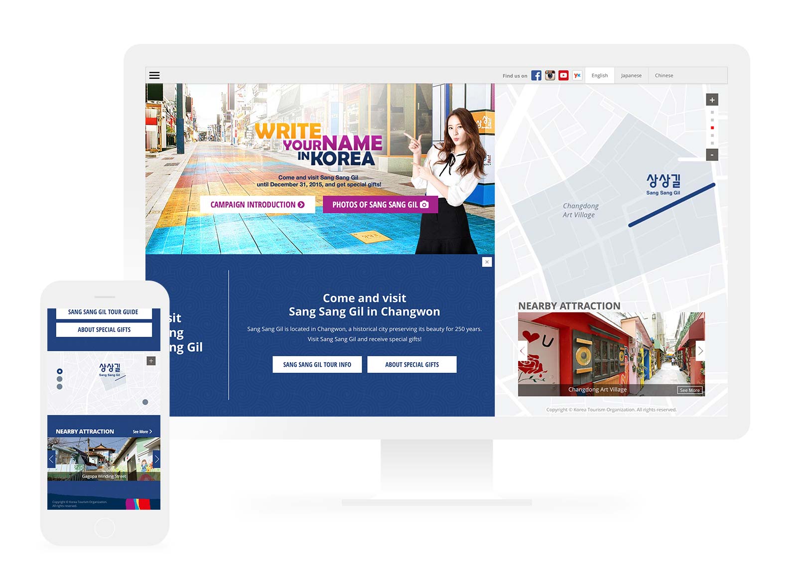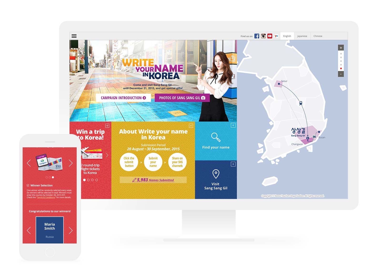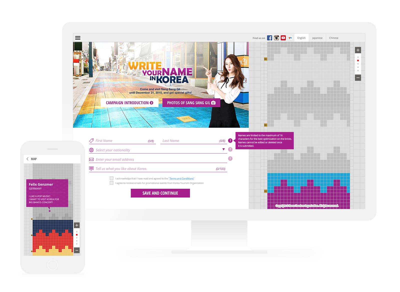 Korea Tourism Organization (KTO) conducted a global campaign to encourage more overseas tourists to visit Korea. By participating in the campaign through a microsite, users got opportunities to have your name physically engraved on Sang Sang Gil (meaning “Imagination Road” in Korean) to mark the first step toward their Korean experience. Using the corporate colours and traditional patterns, the design solution was developed to be quintessentially Korean with modern twist.